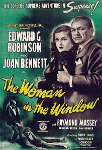 The Woman in the Window is a 1944 movie that stars Edward G. Robinson but here he is playing somewhat out of character. Rather than his usual gangster roles (Little Caesar, Johnny Rocco etc.) he plays a college professor who becomes entranced by the painting of a woman on display in a gallery window near his club. When the woman’s face appears alongside the painting, he turns and finds that it is indeed the same woman. She turns out to be a femme fatale and is wonderfully played by Joan Bennett.